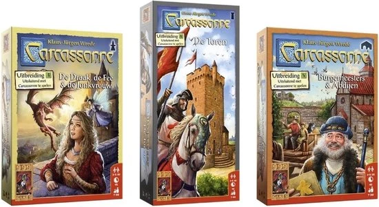 De omgeving van Carcassonne wordt geteisterd door een rondzwervende draak. Dappere helden proberen hun horigen tegen het reusachtige monster te beschermen, maar zonder hulp van de fee staan ze volkomen machteloos. In de stad flirt de jonkvrouw met afgeleide ridders, terwijl boeren via magische poorten aan de aandacht van de draak trachten te ontsnappen. Carcassonne wordt met de uitbreiding De Draak, de Fee en de Jonkvrouw pas echt een sprookje!Hoe combineer ik de verschillende Carcassonne-producten?