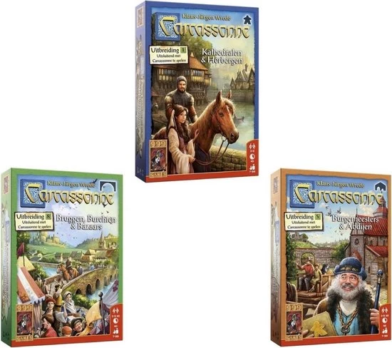Nieuwe versie van de uitbreiding op het populaire legspel Carcassonne Bouw bruggen over steden en kloosters en breid je wegen op een alternatieve manier uit. Bouw je een kleine stad af, dan mag je in plaats van het scoren van punten, kiezen om er een burcht van te maken. Daarmee speculeer je op meer punten later in het spel. Op de bazaar worden tegels geveild, waarbij je met punten moet betalen! Met Bruggen, Burchten & Bazaars krijgt Carcassonne nog meer mogelijkheden en kun je nog meer interessante tactieken bedenken. Met Kathedralen & Herbergen kun je deze uitbreiding ook met 6 spelers spelen.