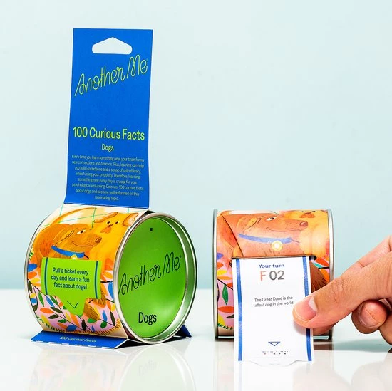 100 Curious Facts van Another Me. Ticketsysteem met honderd feiten over honden. Grappig blik met tickets zoals bij de apotheek, waar feitjes staan die je nog niet kende. Honderd verschillende feiten om meer dan drie maanden lang elke dag plezier mee te hebben. De feiten op de tickets zijn geschreven in het Engels.