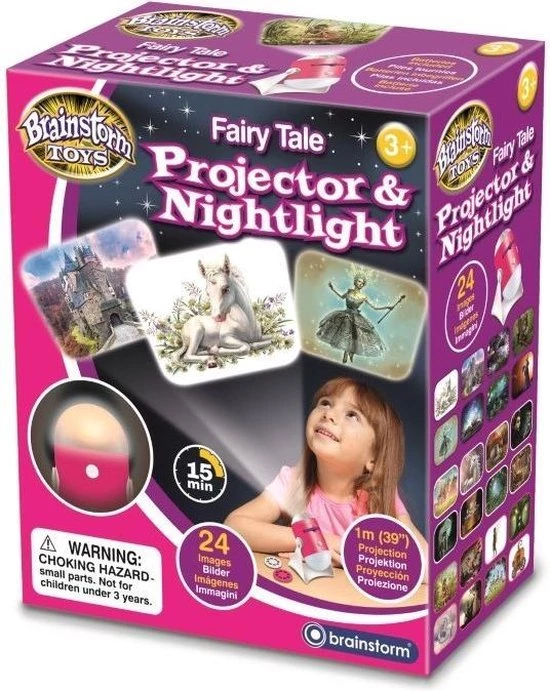 Zakformaat projector die beelden tot een meter breed projecteert op muren en plafonds. Naast een ongelooflijke beeldprojector is dit ook een cool nachtlampje dat ideaal is voor nachtkastjes. Bevat 24 sprookjesafbeeldingen, waaronder fee, eenhoorn, tovenaar, prinses, draak en sprookjeskasteel. Draai de lenskop om de beelden scherp te stellen. Zet de schakelaar eenvoudig in de nachtlichtmodus. U kunt ook het hoofdgedeelte van de projector van de standaard losmaken om als zaklamp te gebruiken. Nightlight heeft een automatische uitschakeling van 15 minuten om de batterij te sparen.