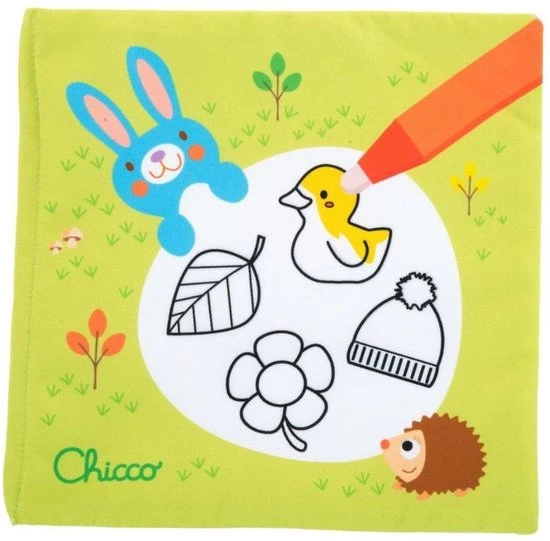 Dit zachte kleurboek is van het merk Chicco. Je kleintje zal het geweldig vinden om de plaatjes in te kleuren. De stift kun je vullen met water en zodra je kindje met de stift kleurt zullen de witten elementen in het boek gaan kleuren! Hierdoor zal je kindje niet onder de stift zitten, maar toch helemaal zelf kunnen kleuren. Wanneer het water weer opgedroogd is, zullen de kleuren weer verdwijnen en is het boek klaar om weer ingekleurd te worden! Het boek is van zacht textiel en alle seizoenen zullen erin voorkomen!