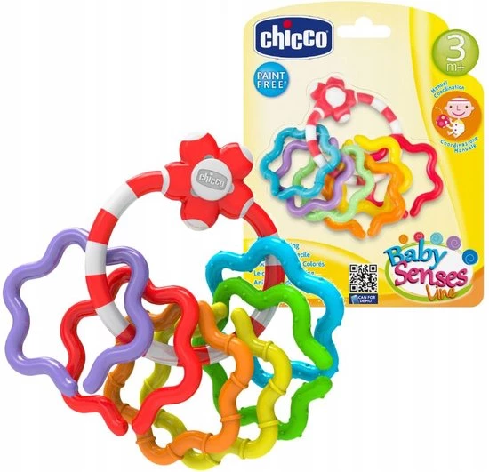 Deze bijtring/rammelaar van het merk Chicco is samengesteld uit 6 ringen van verschillende kleuren die uit de centrale ring kunnen worden verwijderd en aan een andere worden gehaakt. Je kleine kan dus naar hartelust spelen met dit kleurrijke speeltje: rammelen, bijten, friemelen en kijken naar de mooie kleurtjes.
