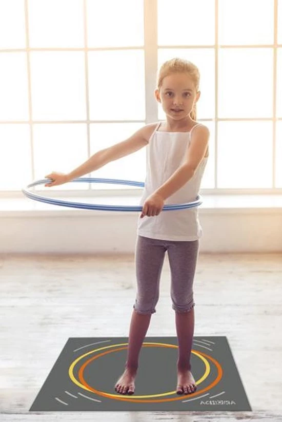 Op elk van de zes matten wordt een andere oefening afgedrukt: handstand, springoefeningen – met hoepels en springtouwen (niet inbegrepen), kan een gevarieerde circuittraining gedaan worden. De oefeningen ondersteunen kinderen in hun lichaamscoördinatie, flexibiliteit, balans en uithoudingsvermogen. Materiaal 100% polyester. Afmetingen: 50 x 50 x 0,5 cm.