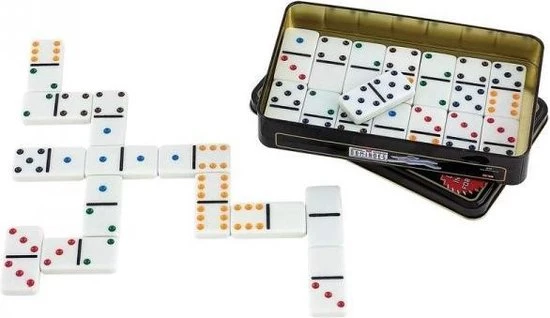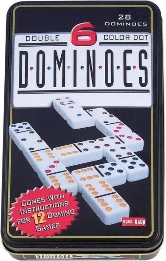 Longfield Games domino dubbel 6 Super leuk domino spel in blik met deksel. Dit domino spel heeft dominostenen van urea kunststof met gekleurde ogen. Specificaties: Kleur: zwart Geslacht: junior Materiaal stenen: kunststof Afmetingen blik: 11 x 18,5 x 3,5 cm Afmetingen stenen: 50 x 25 x 7 mm Aantal spelers: 1+ Leeftijd: vanaf 6 jaar Taal: Nederlands, Engels, Duits, Frans Inhoud: 28 Dominostenen Spelregels