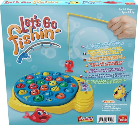 Let’s Go Fishing is het ultieme visspel voor kinderen! Stop de batterijen in het spel, zet hem aan en zie hoe de vissen al ronddraaiend naar boven komen en weer terugzakken.