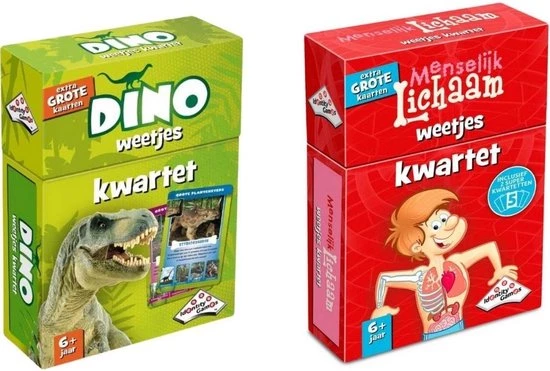 Dino Weetjes Kwartet Kwartetten, een oer-Hollands kaartspel waarin steeds 4 kaarten bij elkaar gespaard worden. Kwartet! Nu over dino’s, afgebeeld op extra grote kaarten. Op deze kaarten staan foto’s en ook nog eens interessante weetjes! Inclusief een superkwartet van 5 kaarten.