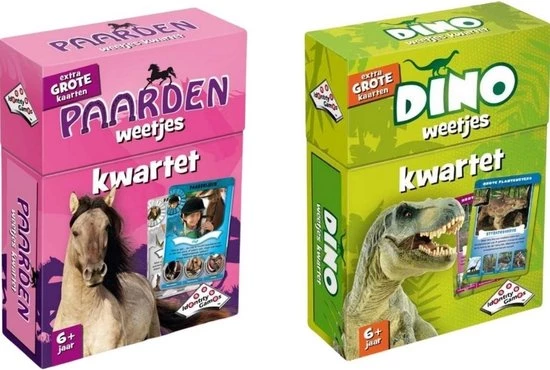 Dino Weetjes Kwartet Kwartetten, een oer-Hollands kaartspel waarin steeds 4 kaarten bij elkaar gespaard worden. Kwartet! Nu over dino’s, afgebeeld op extra grote kaarten. Op deze kaarten staan foto’s en ook nog eens interessante weetjes! Inclusief een superkwartet van 5 kaarten.