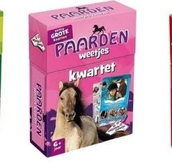 Paarden weetjes kwartet, een oer-Hollands kaartspel waarin steeds 4 kaarten bij elkaar gespaard worden. In dit kwartet vind je allerlei informatie over paarden, afgebeeld op extra grote kaarten. Op deze kaarten staan foto’s en ook nog eens interessante weetjes! Waarom rolt een paard? Wat eet een paard? en nog veel meer! Inhoud: 38 kaarten. Voor 2 tot 4 spelers vanaf 6 jaar. Speelduur: ongeveer 20 minuten.