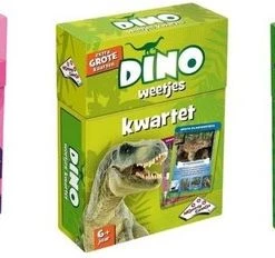 Dino Weetjes Kwartet Kwartetten, een oer-Hollands kaartspel waarin steeds 4 kaarten bij elkaar gespaard worden. Kwartet! Nu over dino’s, afgebeeld op extra grote kaarten. Op deze kaarten staan foto’s en ook nog eens interessante weetjes! Inclusief een superkwartet van 5 kaarten.