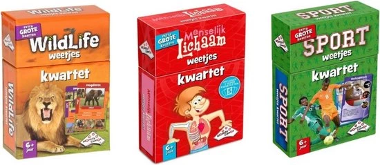 Menselijk Lichaam Kwartet Kwartet is het leukste kaartspel voor de hele familie. Op de kaarten staan de mooiste plaatjes en leukste weetjes. Hoe komt het bijvoorbeeld dat je moet plassen wanneer je water hoort? Inhoud 38 extra grote, gelamineerde speelkaarten+ spelregels. Speelduur 20 min. Aantal spelers 2-4. Leeftijd 6+.