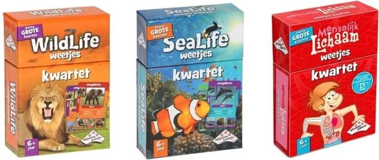 Dit weetjes kwartet is niet alleen een leuk spel.. het is ook nog erg leerzaam. Het Sealife Weetjeskwartet gaat over de dieren uit zeeën en oceanen, afgebeeld op extra grote kaarten.Op deze kaarten staan foto’s en ook nog eens interessante weetjes! Met een superkwartet van 5 kaarten! Hoe oud kan een dolfijn worden? Hoe snel kan een inktvis zwemmen? Hoe zwaar kan een walvis worden?