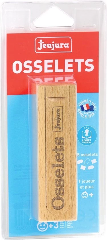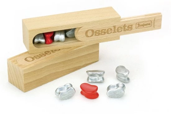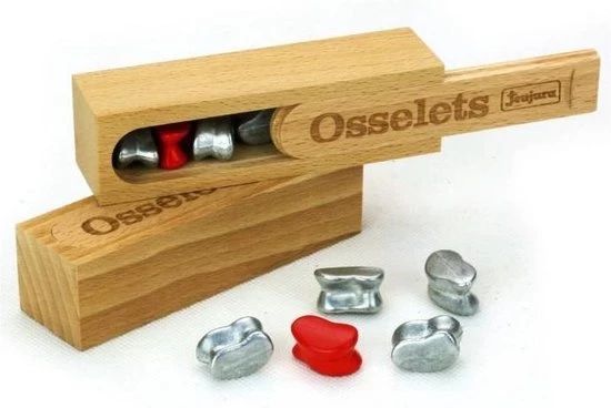 HOUTEN DOOS – OSSELETS: set van 5 gehoorbeentjes in een beukenkoffer: 11,4 x 3,3 x 3,1 cm – Spelregels Vanaf 3 jaar oud.
