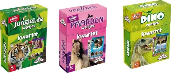 Dino Weetjes Kwartet Kwartetten, een oer-Hollands kaartspel waarin steeds 4 kaarten bij elkaar gespaard worden. Kwartet! Nu over dino’s, afgebeeld op extra grote kaarten. Op deze kaarten staan foto’s en ook nog eens interessante weetjes! Inclusief een superkwartet van 5 kaarten.