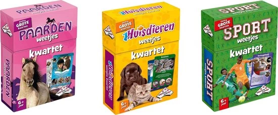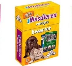 Huisdieren Weetjeskwartet. Kwartet, het allerleukste kaartspel voor de hele familie! Met de mooiste plaatjes en weetjes over je lievelings huisdier. Waarom piept een cavia? En hoe oud kan een goudvis?