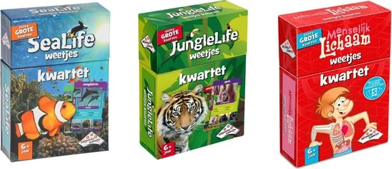 Dit weetjes kwartet is niet alleen een leuk spel.. het is ook nog erg leerzaam. Het Sealife Weetjeskwartet gaat over de dieren uit zee?n en oceanen, afgebeeld op extra grote kaarten.Op deze kaarten staan foto’s en ook nog eens interessante weetjes! Met een superkwartet van 5 kaarten! Hoe oud kan een dolfijn worden? Hoe snel kan een inktvis zwemmen? Hoe zwaar kan een walvis worden?