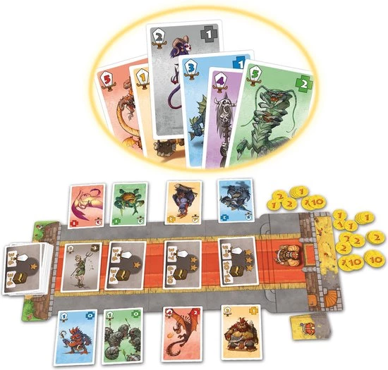 Mighty Monsters EN Queen Games. Mächtige Monster is een semi-coöperatief kaartspel, waarbij de spelers in de huid van orks, draken en andere creaturen kruipen om de schatkamer van de koning te plunderen. De jacht naar de schat en het ontwijken van de koninklijke wachters vraagt om samenwerking, bij het verdelen van de buit viert ouderwets egoïsme hoogtij. Spelregels: Engels. Voor 3 tot 6 spelers. Leeftijd vanaf 8 jaar. Speelduur 35 minuten. Queen Games nr. 10181EN :