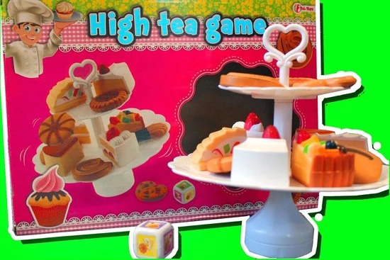 Zet de etagère in elkaar en zorg ervoor dat deze vol is. Gooi met de dobbelsteen en haal het koekje of cakeje van jouw worp van de etagère . De eerste die de etagère laat instorten heeft verloren.