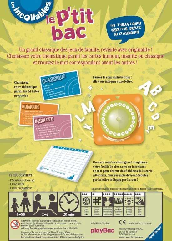 Ravensburger 26567. Genre: Leerzaam bordspel, Speeltijd (max): 20 min, Doelpubliek: Kinderen & volwassenen. Breedte verpakking: 190 mm, Diepte verpakking: 280 mm, Hoogte verpakking: 60 mm. Type commerci?le eenheid: Klant enkele eenheid, (cdm) Additional usage: Indoor, Packaging languages (ISO 639 format): Frans. Breedte pallet: 120 cm, Lengte pallet: 80 cm, Hoogte pallet: 99,5 cm. (cdm) Minimum age: 72 maand(en)