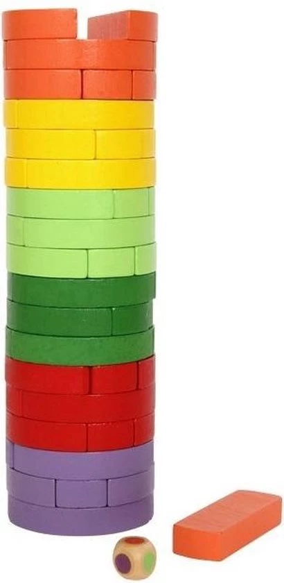 This game requires a steady hand and concentration! The 54 multi-coloured wooden elements have to be piled up to a tower. The coloured die indicates the colour of the next brick that has to be removed. For various gaming options, pile up the tower in same colour-segments or in any colour constellation you like.